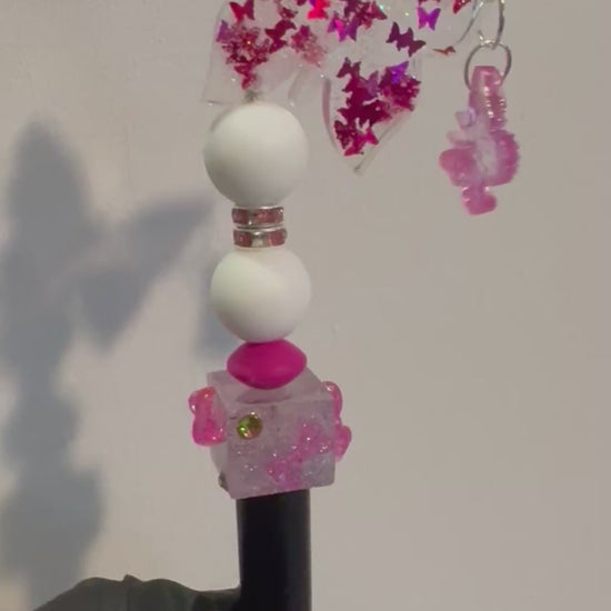 Expertly crafted with resin and delicate beads, this Custom Beaded/Resin Made Pen features an added butterfly charm. Perfect for fans of this elegant creature, this pen effortlessly combines style and functionality for a unique writing experience. Up your pen game with this one-of-a-kind creation.